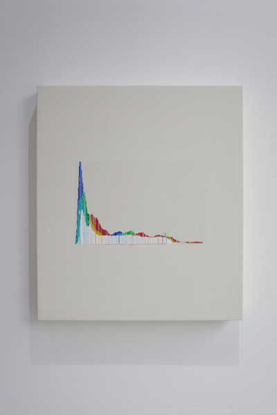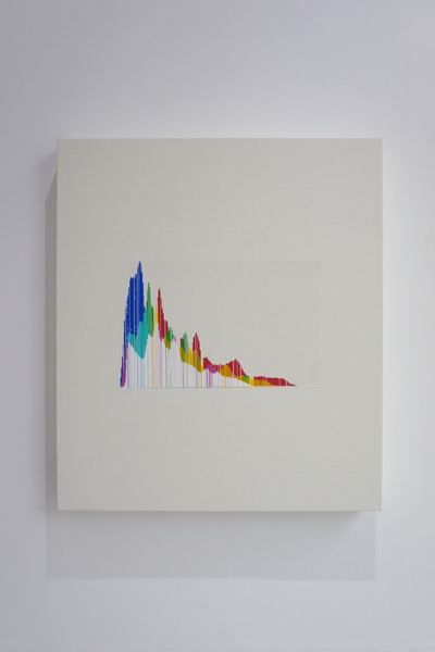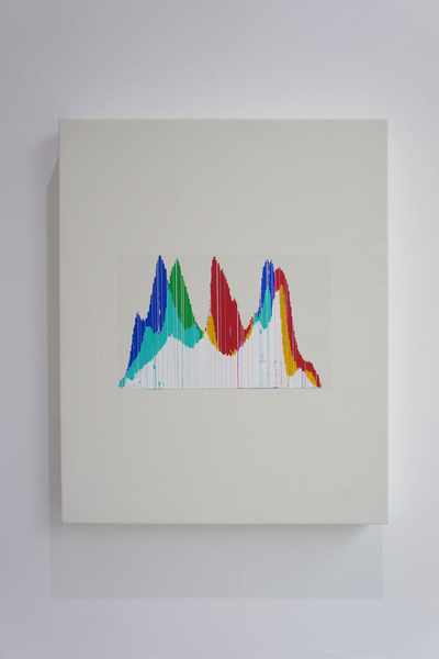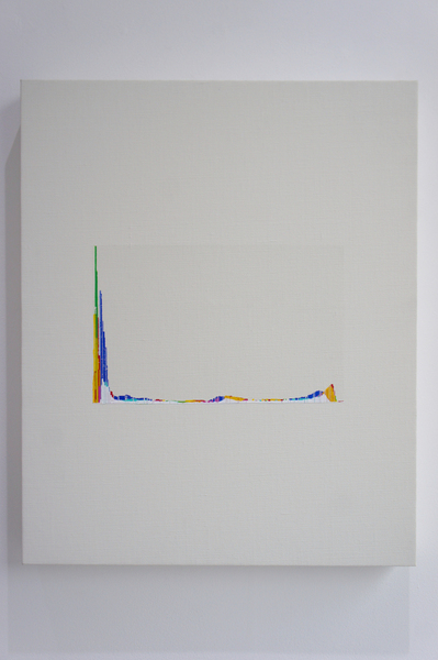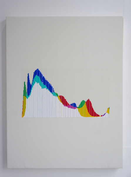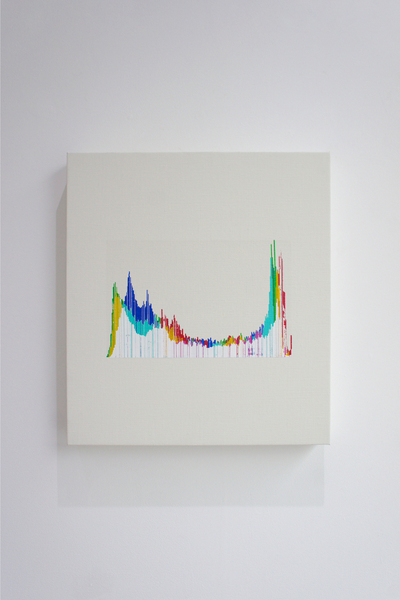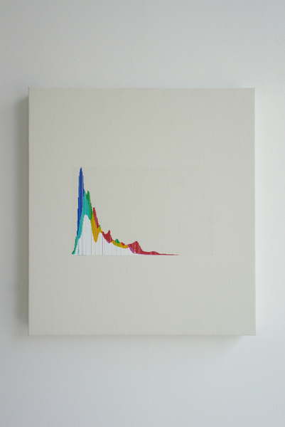 〈RGB〉シリーズは、カロタイプ写真の発明者であるウィリアム・ヘンリー・フォックス・タルボットが、自身の技術をフォトグラフでなく「光で絵を描く」を意味する「photogenic drawing」と呼んでいた事実に着想を得ています。いわゆる「名画」として世界的に共通認識されている絵画の画像をインターネット上から入手し、名画と同寸法で製作されたキャンバス地に、写真を構成するピクセル(画像)の明るさの分布をグラフ化したヒストグラムをを描くことで制作されます。本展ではシリーズ最新作として、ヨハネス・フェルメールの絵画13点をモチーフにした新作を中心に構成いたします。